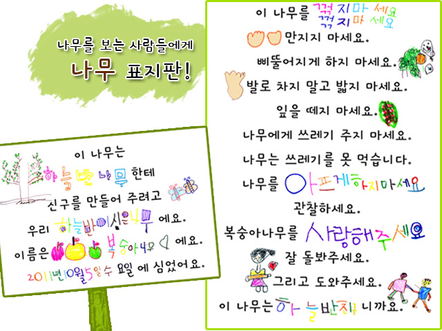 어린이들은 작은 복숭아나무에게 아주 특별한 표지판을 만들어 주기로 합니다. 다른 사람에게 알릴 이야기를 정하기 위해 고민하고 또, 표지판을 꾸미기 위해서 열심히 그림을 그리고 글자도 적습니다. 어때요? 하늘반이 선물한 나무 친구와 표지판! 정말 멋지죠?^^★매체 탐색★