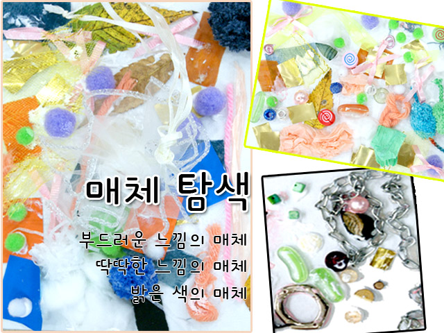 어린이들과 함께 여러 가지 느낌의 매체를 탐색해 보았습니다. 부드러운 느낌, 딱딱한 느낌과 밝은 색, 어두운 색의 매체를 느끼며 찾아봅니다.