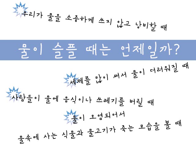 “설거지를 할 때 세제를 많이 써서 물이 더러워질 때 슬플 것 같아요.” “물이 오염되어서 물속에 사는 식물과 물고기가 죽게 되면 물도 슬플 것 같아요.” “사람들이 물이 더럽고 냄새난다고 싫어하면 물은 슬플 것 같아요.” “사람들이 물에 음식이나 쓰레기를 버릴 때 슬플 것 같아요.” “우리가 물을 소중하게 쓰지 않고 낭비할 때 슬플 것 같아요.”