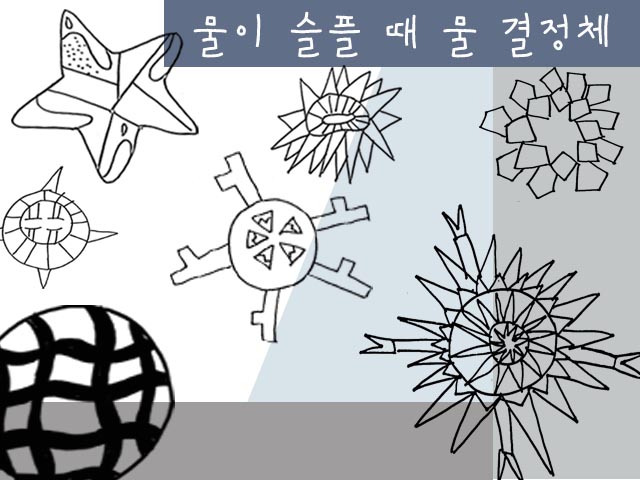 어린이들은 물을 소중하게 사용하면 물도 기쁨을 느끼지만 반대로 낭비하고 오염시키면 슬픔을 느낄 것이라고 생각합니다.그렇다면 물이 슬플 때의 결정체는 어떤 모습일까요? “물 결정체도 깨어지고 까만 줄이 생길 것 같아요.” “물이 화가 나서 뾰족한 가시가 생길 것 같아요.” “슬픈 마음이 들면 물도 울고 있을 것 같아요.” “결정체에도 더러운 찌꺼기가 묻어 있을 것 같아요.” “물이 오염되면 결정체도 까만색으로 변할 것 같아요.” “도깨비처럼 뿔이 나고, 화난 눈을 가진 결정체로 변할 것 같아요.” 사람이 기분에 따라 표정과 모습이 달라지는 것처럼 어린이들은 물 또한 슬플 때는 아름답지 않은 모습을 하고 있을 것이라고 생각합니다.