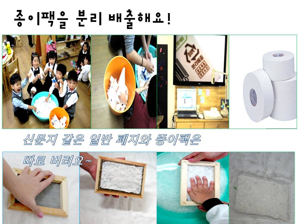 햇살반 친구들과 함께 지금까지 헌 종이에게 새 생명을 준 방법에 대해 이야기를 나누어보았답니다. 교사: 헌 종이에게 새 생명을 줄 수 있는 방법에는 어떤 것들이 있었나요? 유아1: 종이를 아껴써요. 유아2: 구겨진 종이도 다시 사용해요. 유아3: 종이쓰레기통 안에 사용할 수 있는 종이를 찾아요. 유아4: 도화지에 그림을 그려서 코팅된 종이로는 아름다운 모자이크를 할 수 있어요. 우리들이 헌 종이에게 새 생명을 준 방법을 다시 생각해보면서 버려진 종이를 다시 모아 헌 종이를 새 종이로 만들 수 있다는 것을 기억할 수 있었고 종이를 스스로 절약할 수 있는 습관을 기를 수 있었답니다. 친구들과 함께 헌 종이에게 새 생명을 줄 수 있는 방법에 대해 이야기를 나누어보세요.<종이팩의 변신>