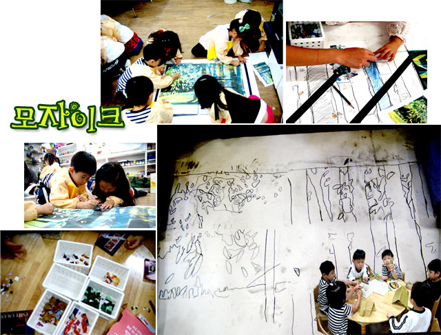 우리 주변에 볼 수 있는 종이팩은 우유, 쥬스 등이 있답니다. 친구들과 함께 먹고 난 우유팩에도 코팅된 종이와 사용할 수 있는 종이로 분류합니다. 물에 담가두니 우유팩의 코팅된 종이와 사용할 수 있는 종이가 잘 분류되었답니다. 종이죽을 그물망에 올려보니“매끈 매끈해요.” “그물망에 올려놓으니 종이죽이 자꾸 도망가요. 부드러워서 그런가봐요.”종이팩은 천연펄프를 사용해 만들어지기 때문에 따로 모아 재활용을 하면 고급화장지나 벽지로 재탄생 할 수 있답니다. 가정에서도 친구들과 함께 신문지등의 일반폐지와 종이팩을 함께 버리지 않고 따로 분리해서 버려 보고 종이팩은 씻어 펼친 뒤 말려서 분리배출을 해보는 것은 어떨까요? 종이팩만 잘 재활용해도 환경을 지킬 수 있답니다.<코팅된 종이를 모자이크로 변신시키기>