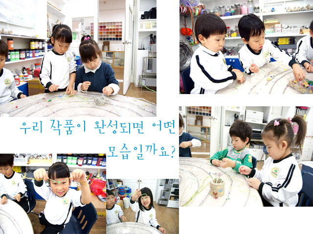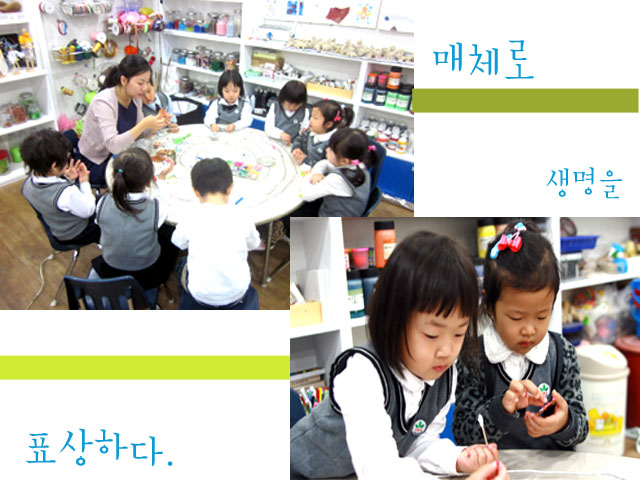 “똑같이 소중해요. 사람도 기린도 코끼리도 나무도..” “왜 그렇게 생각하니?” “우린 똑같이 생명이 있잖아요.” 지금까지 아이들은 동화 속 이야기 또는 어른들의 이야기를 통해 ‘꽃은 꺾으면 안 된다’ 는 말을 수 없이 들었을 것입니다. 그런 말들은 나와 ‘관계맺음’이 없는 단순한 말이기에 아이들이 실천의지를 보이지 않았을 것입니다. 하지만 생명이라는 것을 충분히 탐구하면서 관계 맺음을 해 나가고 있는 지금 새싹반 아이들은 생각이 조금 달라졌다는 것을 생활 속에서 느낄 수 있습니다. 이번 생명 탐구를 통해 아이들이 ‘생명’이라는 것은 나뿐만 아니라 나와 다른 모습을 한 친구들(사람, 동물, 식물 등..)에게도 있다는 것을 알고, 내가 소중하듯 다른 생명을 가진 것들도 소중하다는 것을 단순 지식이 아닌 마음으로 느끼며 살아아길 기대 해봅니다.<생명을 표현해요-매체 순환작업>