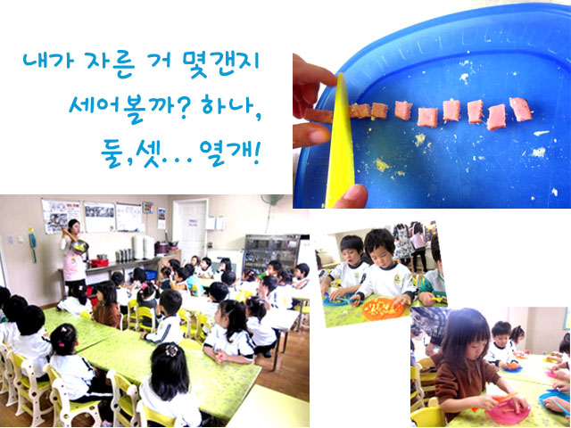 요리활동 재료를 알아보기 위해 한 유아가 퀴즈를 내어 봅니다. “이것은 땅 속에서 살아. 감자 같기도 해.” “당근?” “파?” “아! 고구마” 아이들은 친구의 이야기를 들으며 오늘 사용될 재료를 유추 해 봅니다. 고구마 샐러드를 만들기 위해 요리 활동 순서를 알아보고 오감을 사용하여 재료를 탐색 해 봅니다, “아~이상한 냄새난다.” “흙냄새다.” 샐러드에 들어갈 각 재료를 충분히 탐색 한 후 도구를 사용하여 요리를 시작 해 봅니다. “하나, 둘, 다섯, 여섯...나는 10개 잘랐어요.” “나도 세어볼까?” “난 열 다섯 개” “나는 여덟 개” “이제 섞어서 샐러드 만들어 보자.” “와~슝~다 섞였어.” “맛있겠다!” 유아들은 요리활동을 하면서 수세기, 물질의 굳기와 무르기, 물질의 변화과정을 자연스럽게 경험하게 됩니다.