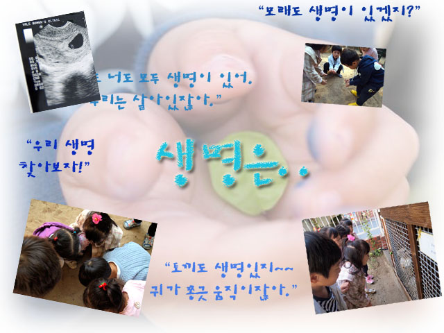 만3세 아이들은 <생명> 이라는 조금 어려운 단어를 어떻게 풀어낼까요? “생명은 살아있는 거예요.” “개미도 생명이 있고 반딧불도 생명이 있어요.” “꽃” “나무” “바다에도 생명이 있어요. 조개가 살고 있잖아요.” “벌레도 생명이 있어요. 벌레는 색깔이 바뀌잖아요. 카멜레온 처럼” 교사: 생명이 있다는 것을 어떻게 알 수 있나요? “움직이는 건 생명이 다 있는 거예요.” “나무도 바람이 불면 살랑살랑 움직여요.” “달님도 살아있어요. 달님도 조금씩 움직여요.” “모래도 생명 있어. 모래도 사람 손에서 떨어지면서 움직이잖아.” 아이들은 <생명>이 ‘살아있으며 움직이는 것’ 이라는 생각을 하고 있으며 우리 주변에서 생명을 가진 것들을 찾아봅니다.