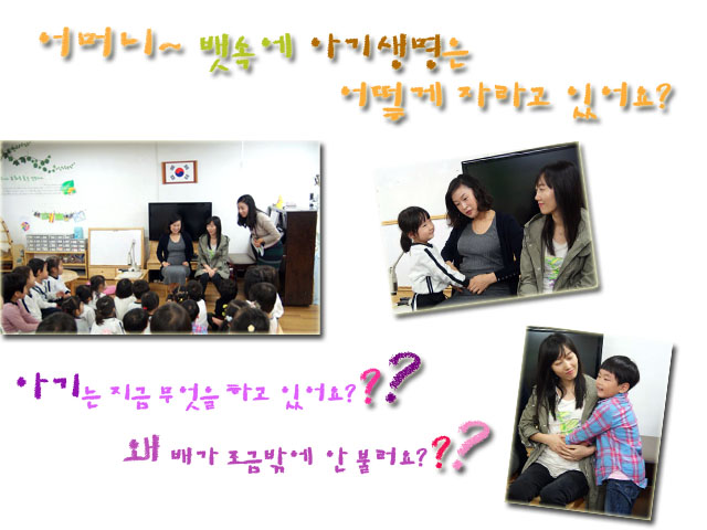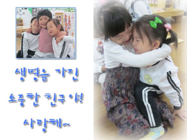 “나요! 나도 생명 있어요. 선생님도 친구들도 모두 생명이 있어요!” “생명은 내 몸 속에 있는데 처음에는 작았는데 점점 커지는 거예요.” “처음에는 생명이 없는데 어른이 되면서 생명이 점점 커져요.” “머리부터 발끝까지 생명이 있어요.” 아이들은 <나>에게 생명이 있다는 생각을 했으며 태아 사진을 보며 사람에게 있는 생명을 탐구 해 봅니다. “와~진짜 작다” “아기 아닌 거 같아요.” “콩이다 콩!” “아기 손가락이랑 발가락도 커져요.” “어? 배꼽이다 배꼽!” “아기가 점점 커져서 움크리고 있어” 아이들은 콩알 만하던 태아가 성장하여 지금의 내 모습이 되었다는 그 사실을 알아가면서 생명의 신비함을 조금씩 느껴갑니다. 좀 더 깊고 직접적인 경험을 하기 위해 뱃속에 아이를 가진 새싹반 어머님을 초대하여 이야기 나누어 봅니다.Q. 왜 이렇게 배가 불러요? “아줌마 뱃속에는 아기가 자라고 있어서 배가 불러요. 그리고 아기는 양수라는 물에서 헤엄도 치고 손가락도 빨고 잠도 자고 있어요.” Q. 언제 아기가 나와요? “아기는 10개월이라는 시간동안 뱃속에서 쑥쑥 자라면 그때 나와요.” “우리 친구들도 엄마 뱃속에서 오랜 시간 동안 쑥쑥 자라서 태어난 소중한 생명을 가진 친구들이예요.” 어머니와의 만남 후 아이들은 이야기 합니다. “니도 뱃속에 있었제?” “안 무서웠어?” 그리고 모두 함께 이야기 해 봅니다. “소중한 생명을 가진 친구야. 사랑해.” 이번 활동을 통해 아이들이 친구 한 명 한 명이 생명을 가지고 있는 소중한 존재라는 것을 느끼고 서로를 아끼고 더욱 사랑 해 보길 기대 해 봅니다. 아이들은 사람 외에 또 어떤 것에서 생명이 있다는 것을 알고 소중함을 느껴 갈까요?<재미있는 글자놀이>