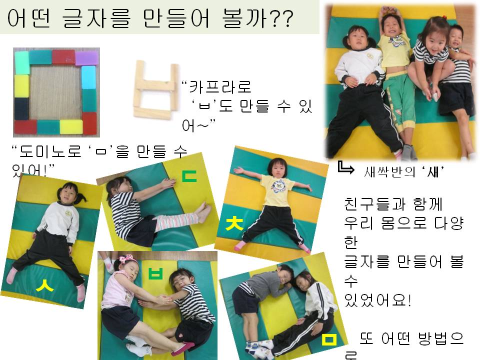 “손가락 하나, 손가락 하나를 합치면 ㄱ이 되지요.” “내가 다리를 벌리면 ㅅ이 돼!” “ㄹ을 만들려고 하는데 나 혼자는 안되겠어...” “내가 ㄱ을 만들게 네가 ㄷ을 만들래?” “새싹반에 새를 만들려면 ㅅ다음에 ㅏ,ㅣ를 만들어야 해.” “(친구들의 몸을 움직이며)이렇게!”