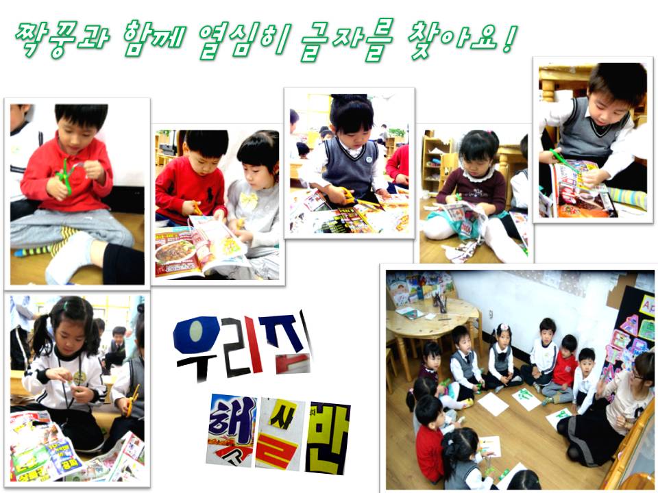 아이들과 글자를 배움에 있어서 공부가 아닌 게임으로 접근을 해봅니다. 두 명씩 짝꿍을 정해 교사가 칠판에 적은 글자를 신문지와 잡지 속에서 글자를 찾아봅니다. 교사: 두 글자부터 찾아보자~ 나비를 찾아보세요. 유아1:‘ㄴ’과 ‘ㅏ’ 합하니까 ‘나’가 되었어. 유아2: 난‘비’를 찾았어~‘나’와‘비’를 합하면 나비 완성! 유아3:글자가 잘 보이지 않아 유아4:괜찮아~ 같이 찾으면 금방 찾을 수 있을 거야! 짝꿍과 함께 힘을 합하여 신문지와 잡지에서 찾은 글자를 하나하나씩 조합해면서 글자를 만들어봅니다. 글자를 알아간다는 것이 어렵고 힘든 공부가 아닌 일상 속이나 게임을 통해서 나와 함께 한다는 것을 자연스럽게 알아간다면 친구들이 좀 더 즐겁게 글자를 알아가지 않을까요?<즐거운 가을 소풍>