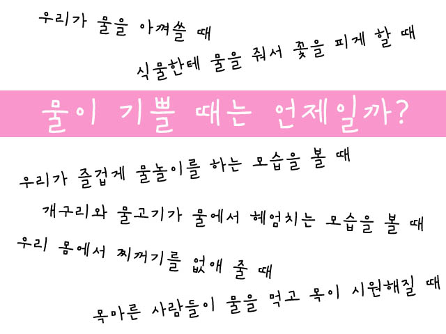 물에게 어떤 말을 보여주느냐에 따라 물 결정체의 모습이 달라짐을 책으로 경험한 어린이들은 물이 살아있음을 느끼게 되었습니다. 그렇다면 물은 언제 기쁨을 느낄까요? “깨끗한 물 친구들이 많을 때 좋아요.” “식물한테 물을 줘서 꽃을 피게 할 때요.” “우리 몸에서 찌꺼기를 없애줄 때요.” “사람들이 즐겁게 수영을 하면 물도 기뻐해요.” “개구리랑 물고기 친구들이 살 수 있어서 기쁠거에요.” 그런데 어린이들의 이야기에는 하나의 공통점이 있었습니다. 단순히 ‘물이 깨끗할 때’가 아니라 물이 낭비되지 않고, ‘필요한 곳에 적절하게 사용될 때’ 기쁨을 느낀다는 것이었습니다. 어린이들의 말처럼 물 보호의 첫걸음은 물의 소중함을 느끼면서 필요한 곳에필요한 만큼의 물을 사용하는 것인 것 같습니다.
