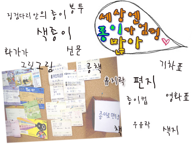 이면지에 대한 이야기를 나눈 후 어린이들은 교실 안의 다양한 종이에 관심을 가지기 시작했습니다.