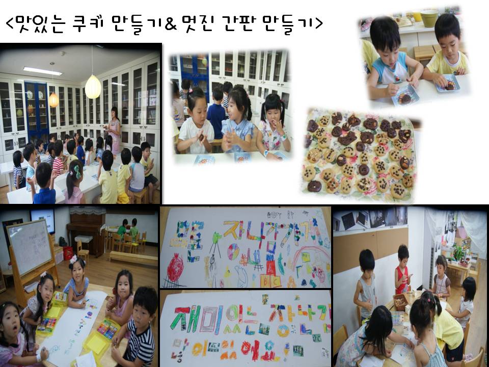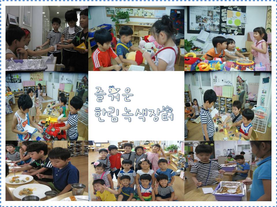 곧 있을 시장놀이준비로 바빴습니다.친구들과 맛있는 쿠키를 만들어<시장놀이> 때 팔기로 계획했답니다.초콜릿 반죽과 바닐라 반죽으로 아몬드, 땅콩, 초코 등 다양한 재료로 꾸밉니다. 마지막으로 만든 쿠키를 오븐에 구우면 완성!완성된 쿠키를 보며 너무나 행복해 하는 햇살반 친구들.<우리가 만든 쿠키>가 시장놀이 때 잘 팔릴까요? 다음으로 간판을 만듭니다.교사:장난감 가게 이름을 뭐라고 할까요? 모든 장난감가게,재미있는 장난감가게,한림장난감가게등 장난감가게이름 중에서 투표를 통해“모든 장난감가게”로 결정됩니다. 간판을 예쁘게 꾸미고 사람들이 물건을 많이 살 수 있도록 햇살반을 멋진 장난감 가게로 만드느라 바쁜 하루를 보냈답니다.<신나는 한림녹색장터>