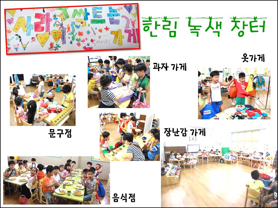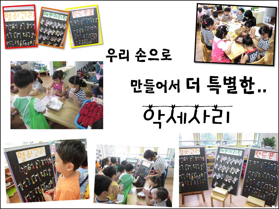 “핸드폰 줄, 열쇠고리, 머리핀을 전시하려면 전시대가 3개 필요해~!” “큰 판이 좋을 것 같아~ 멀리서도 잘 볼 수 있게~” “리본이랑 레이스로 꾸미면 좋을 것 같아요~” 우드락판으로 만든 전시대가 완성되고, 우리가 만든 악세사리 하나하나에 행복마음 담은 스티커를 붙여 전시 합니다. “친구들이 빨리 사갔으면 좋겠다~” “우리가 만들어서 그런지 더 멋있는 것 같아~” 열심히 준비하며 기다렸던 녹색장터 날!! 오고가는 친구들 모두의 마음에 사랑이 싹트길 바라며 가게 이름도 멋있게 지어봅니다. 우리가 모은 마일리지로 구매할 상품도 꼼꼼히 체크해보고, 역할도 나누어 맡습니다. 이슬반에는 다양한 물건들이 많았지만 방문한 친구들에게 가장 인기있었던 상품은 바로 핸드메이드 악세사리였답니다. 만든 악세사리를 정성스럽게 포장해 주며, 또 한번 사랑의 마음을 전해 봅니다. 녹생장터는 끝이 났지만 악세사리에 대한 관심을 이어 다양한 악세사리 만들기에 도전 해보려고 합니다. 기대해 주세요!!