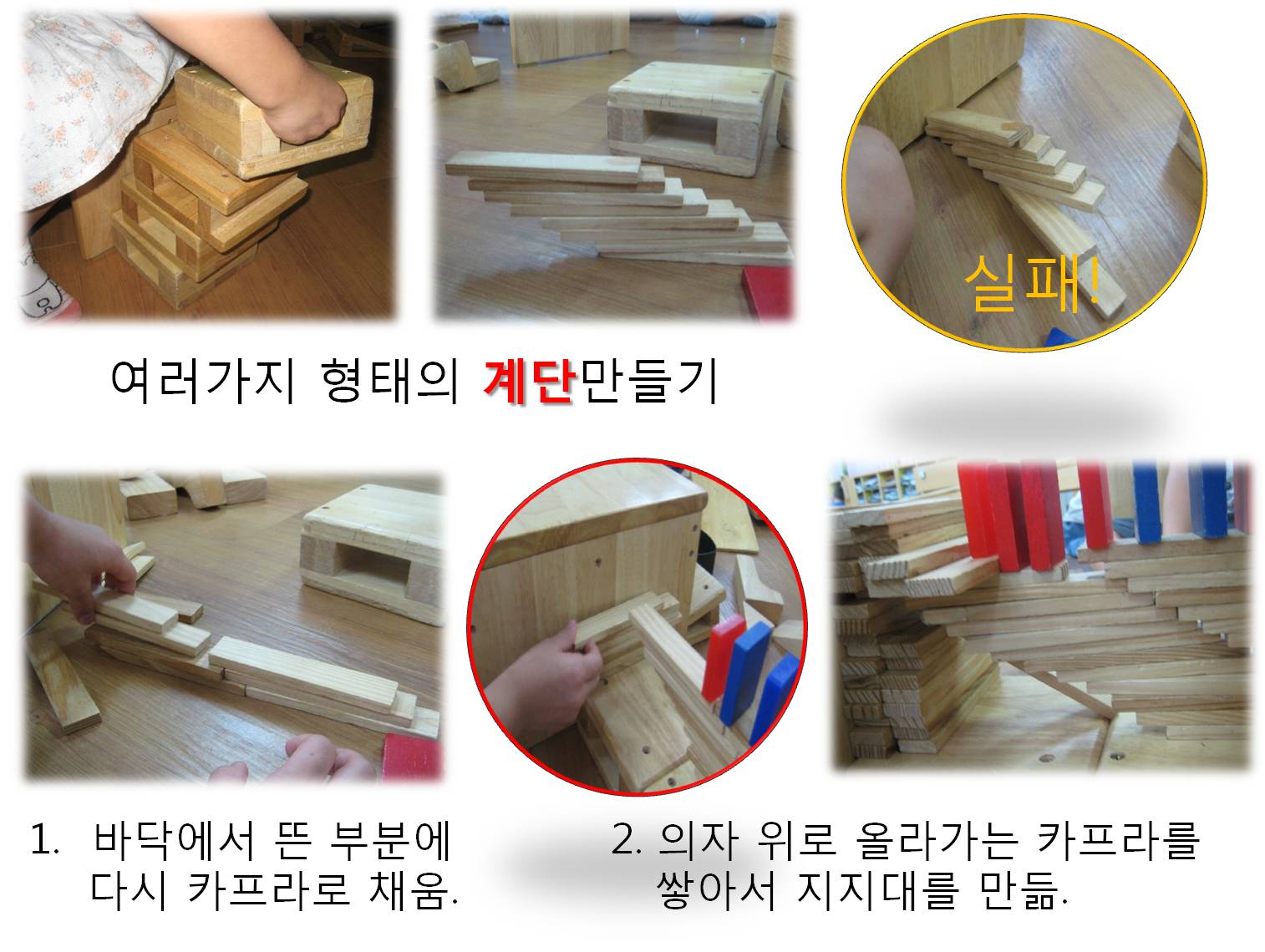 도미노가 올라갈 수 있는 계단을 만들기 위해 유아들은 큰 유니트 블록을 활용 해보고, 카프라도 활용해봅니다. 큰 유니트 블록은 너무 높아서 도미노가 넘어지지 않는 문제점으로 낮은 카프라로 결정! 카프라로 쌓다 보니 카프라가 한쪽으로 자꾸만 기울어집니다. 유아들은 반대 쪽 밑부분이 비어 있다는 것을 발견하고, 카프라 아래쪽을 채워 카프라 계단이 넘어지지 않게 지지대를 만들어 줍니다. 하지만 튼튼하지 못해 자꾸 넘어집니다. 이 때 한 유아가 카프라를 옆으로 길게 쌓아봅니다. 아래부분부터 차곡차곡 쌓아나가니 빈틈없이 카프라로 채워집니다. 이렇게 계단을 만드니 카프라도 많이 들어가고, 힘도 들었지만 튼튼한 계단을 만들 수 있었습니다. 바닥과 의자로 이어지는 계단을 만들어 그 위에 도미노 블록을 쌓아봅니다. 몇 번의 실수로 도미노가 넘어졌지만 끝까지 도미노를 모두 쌓았습니다. 드디어 결과를 볼 시간! 두근대는 마음으로 도미노를 넘어뜨렸더니 결과는 성공!! 실패를 경험하며 멈추고 싶은 마음이 들기도 했지만, 유종의 미를 거둔 유아들에게는 성공의 기쁨이 더 크게 남습니다. 놀이하는 과정 속에서 유아들이<유종지미>를 실천하고, 마음으로 느끼기를 바래봅니다.