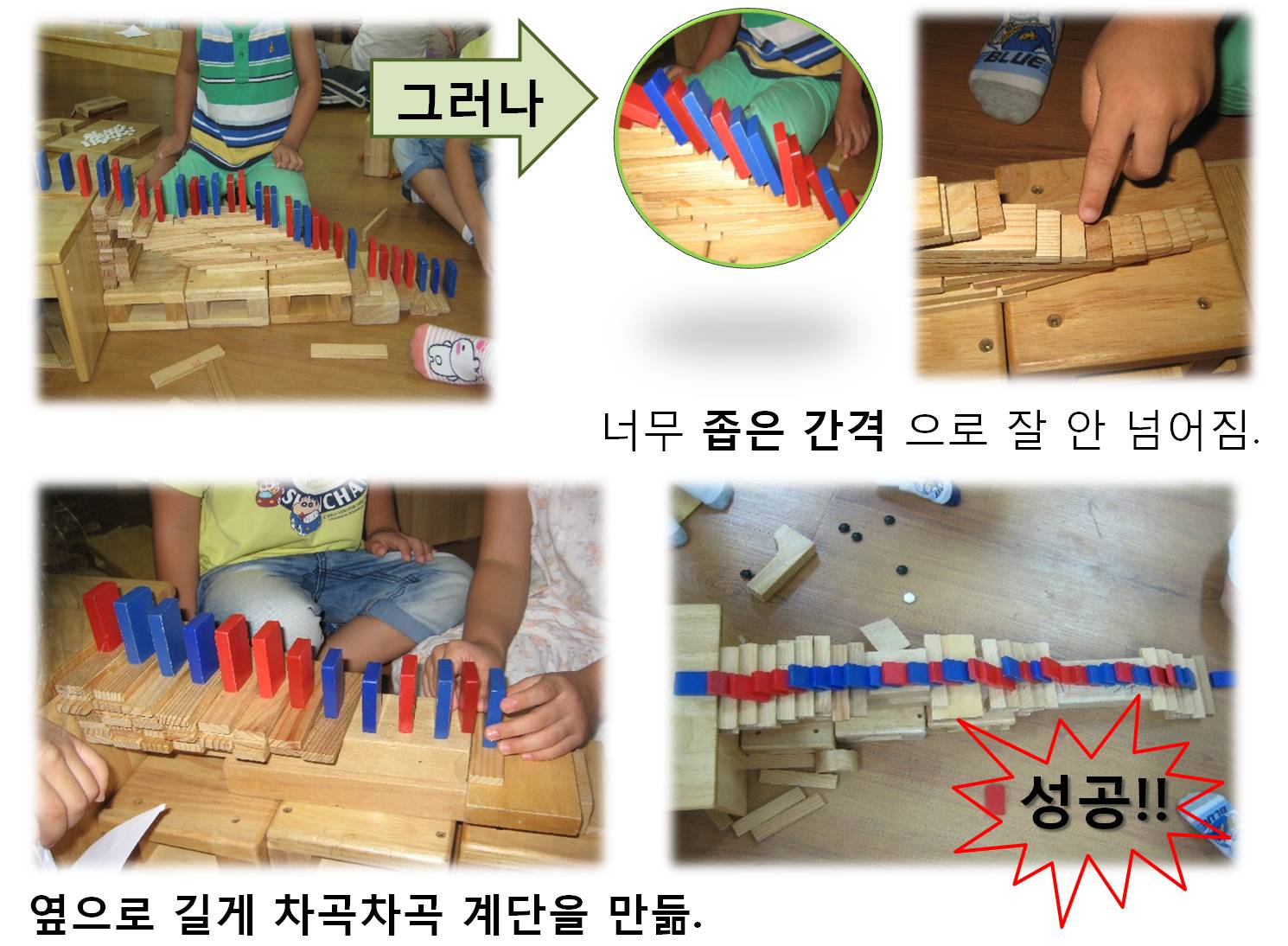 올라가는 도미노를 쌓기 위해 연구를 하게 된 유아들은 우리가 높은 곳을 올라갈 때 계단을 이용하듯이, 도미노도 계단을 이용하면 위로 올라갈 수 있다고 생각합니다.
