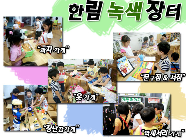 - 한림 녹색 장터에는 악세서리 가게, 장난감 가게, 문구점과 서점, 옷 가게, 과자 가게, 음식점이 있었습니다. 그 중에서 하늘반 친구들은 음식점 주인이 되어보았습니다.