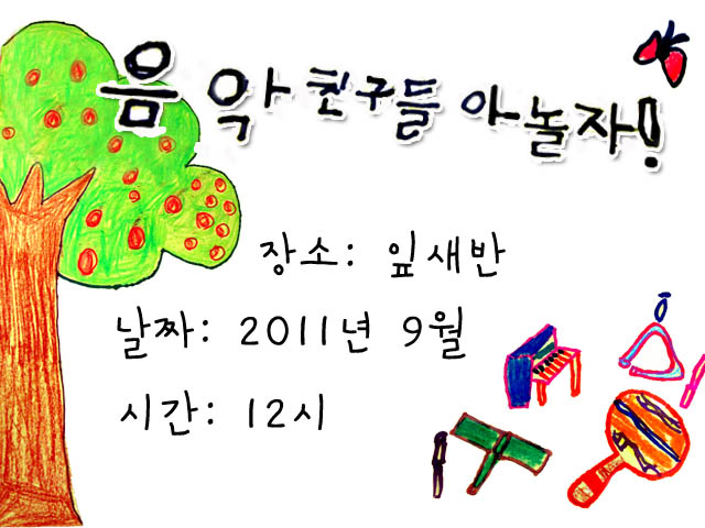 “언제 어디서 하는지 적자.” “제목이 있어야 음악회인줄 알 수 있어.” “그림은 무엇을 그리지?” “음악회니까 악기 어때?” “나무 그림도 들어가면 좋겠어.”