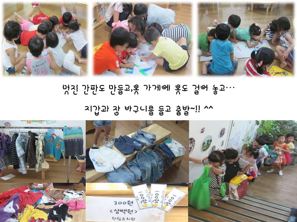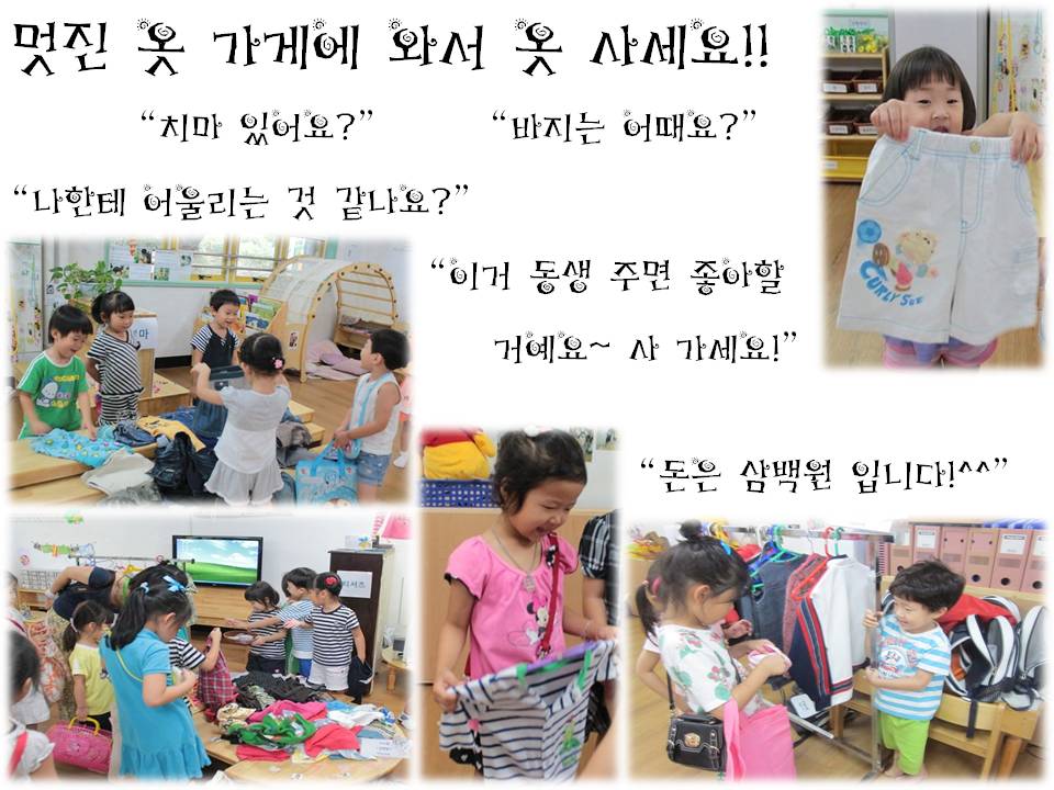 어떤 말을 적으면 사람들이 많이 사러 올까요?" "멋진 옷가게?" "예쁜 옷이 많으니까 예쁜 옷가게." "모두 다 오라고 다 오세요~가게는 어때?" 아이들은 의견을 모아 <멋진 옷가게> <예쁜 옷가게>로 정하고 힘을 합하여 간판을 완성하여 문 앞에 걸어둡니다.