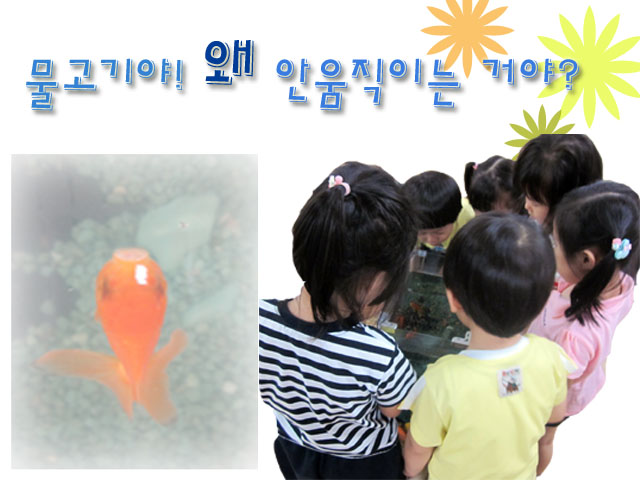"물고기가 안 움직여요.” 물고기를 보며 호기심과 걱정하는 마음이 담긴 아이들의 목소리가 들립니다.“왜 안 움직이지?” “물고기 가만히 생각하고 있는 거야” “물고기야, 배고파? 내가 먹이 줄까?” “물고기야 자는 거야?” “물고기 죽은 거 같은데..?” 아이들은 어항 앞에서 물고기에게 말을 건네 보기도 하고 먹이를 줘 보기도 합니다. 교사와 함께 물고기의 죽음을 확인한 후 모두모여 이야기 나누어 봅니다. “왜 물고기가 죽었을까요?” “나는 물고기한테 매체물도 안 넣었는데..” “밥도 줬는데..” “아! 밥 줄 때 너무 많이 줘서 죽은 거 같아요.” 지난 번 물고기가 죽고 다시 잘 키워 보겠다고 다짐 한 후 새롭게 온 물고기가 또 죽었기에 아이들은 더 미안해하고 속상 해 합니다.