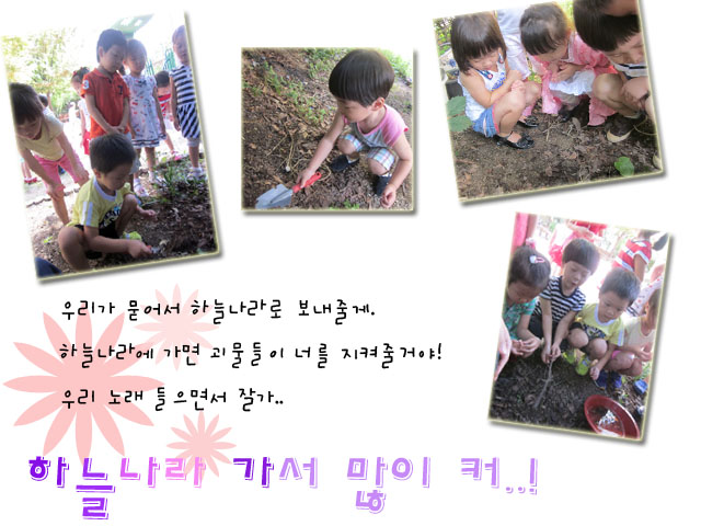 “하늘나라로 갈려면 묻어 줘야 해요.” “할머니도 땅에 묻어줬어요.” “물고기가 죽으면 하늘나라로 가서 눈에는 안 보이지만 괴물들이 지켜줘요.” 아이들은 물고기를 묻어주고 기도를 하고 노래를 불러줍니다. “물고기 하늘나라 잘 가라고 노래 불러줄래요!” “물고기야 하늘나라에 가서 많이 커”아이들에게 물고기의 죽음은 어른들이 생각하는 ‘끝’이라는 의미 보다는 ‘하늘나라’ 라는 새로운 공간에서 또 다른 삶을 살아가는 것을 다가오는 것 같습니다. 바깥놀이만 나가도 아이들은 “메뚜기가 폴짝 뛰어요.” “살아있는 매미 잡았어요!” 라고 말하며 <살아있는 것>에 많은 관심을 보입니다. 이처럼 우리 주변에는 살아있는 것들이 많으며 함께 살아갑니다. 물고기의 경험을 바탕으로 주변의 생명을 가진 많은 것을 찾아보며 <생명의 소중함>을 느껴보려고 합니다. 만3세 아이들이 생각하는 생명은 무엇이며 아이들은 어떤 언어로 생명에 대한 생각을 풀어 나갈까요?