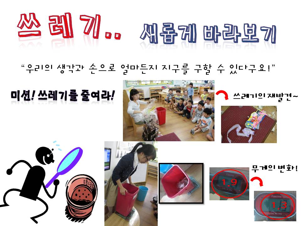 “지저분하고 냄새나는 것” “더럽다” “파리가 많다” “썩은 냄새가 난다” “만지고 싶지 않다” “꼬질꼬질 하다” “비워도 비워도 냄새가 난다” “버려도 버려도 끝이 없다” “쓰레기가 많은 곳에서 살기 싫다” “쓰레기 때문에 우리가 살기 힘들어 진다” “환경오염을 시킨다” 아이들이 가지고 있는 쓰레기에 대한 부정적인 이미지.."쓰레기가 쓰레기라는 편견" 을 새롭게 바꾸어 쓰레기에 대한 긍정적인 경험을 떠올려 봅니다. "지난번에 집에 파리가 들어왔는데 쓰레기 때문에 파리를 밖으로 보낼 수 있었어요~" "쓰레기 중에도 우리가 사용할 수 있는 것이 있어요~" "우리가 먹은 음료수병이랑 과자상자로 놀이시간에 멋지게 변신시켜서 작품을 만들었을 때 기분이 좋았어요" "쓰레기도 우리가 노력하면 얼마든지 줄일 수 있을 것 같아요"