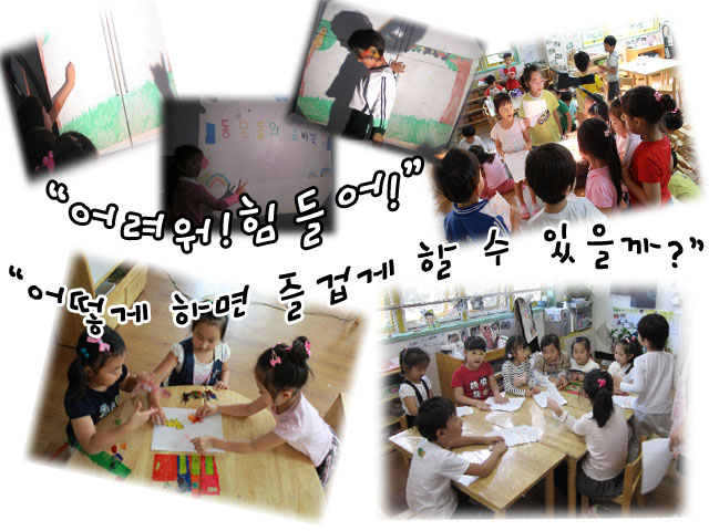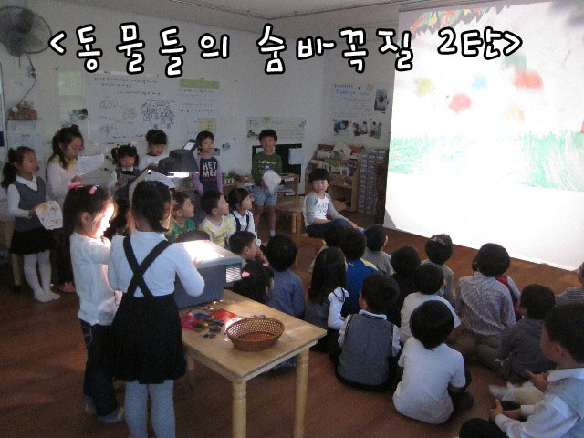 그러나 배경을 담당하는 유아들은 2탄에서 특히나 어려움을 더 느끼게 됩니다. OHP의 특성상 눈이 빨리 피곤해지기도 하고, 배경과 등장인물이 늘어남으로써 대사하는 친구들과의 호흡도 맞아야 하는 어려움을 극복하기 위해 유아들은 OHP가 아닌 책상에 흰종이를 깔고 연습을 하거나 자신들이 직접 대사를 하면서 배경을 바꾸기도 하고, 배경팀 안에서의 역할도 바꾸어봅니다.