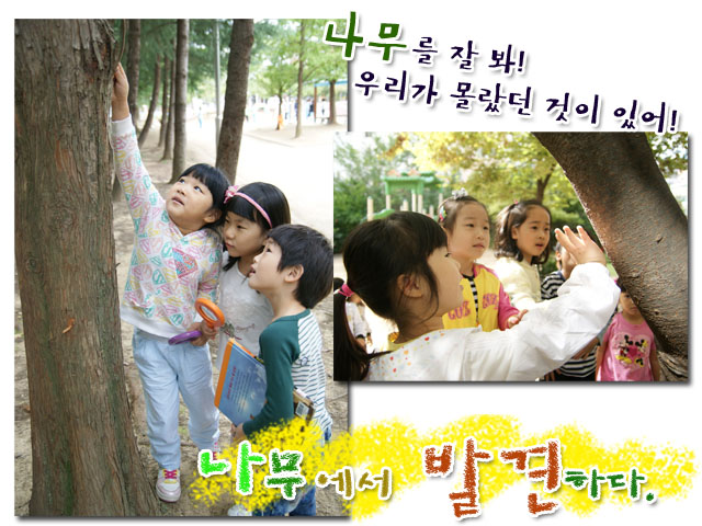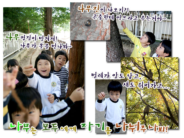 “나무껍질은 우리가 손으로 떼지 않아도 저절로 떨어져요. 우리가 옷을 갈아입는 것처럼 나무도 옷을 갈아입나 봐요~”