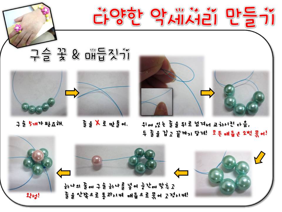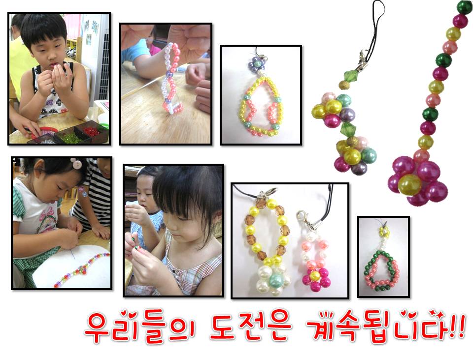 "그냥 한 줄로 하는 것 보다 구슬로 꽃모양을 만들면 더 예뻐~!" "친구들 가방에 달고 다닐 수 있도록 가방고리를 만들면 좋을 것 같아"
