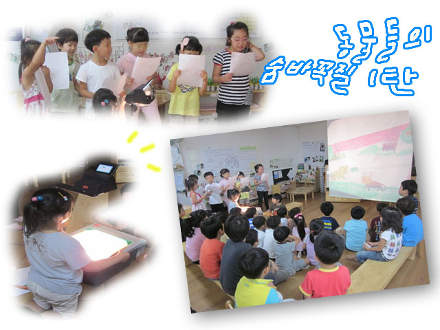 다음 이야기 기대해 주세요!!<인형극 만들기> 인형극팀 유아들은 인형극 공연을 위해 서로에게 피드백을 주고받으며 열심히 인형극 연습을 하며 준비합니다. “오늘은 인형극을 들려줄 수 있을 것 같아요!!” 열심히 연습하던 유아들은 드디어 <동물들의 숨바꼭질1탄>을 친구들에게 들려주게 됩니다. 스크린을 내리고, OHP에 미리 배경과 등장인물을 준비해놓고 기다립니다. 드디어 인형극이 시작되고 진지한 분위기에서 연기자도 관객도 모두 집중해서 인형극을 봅니다. 인형극이 끝난 뒤 이슬반 유아들은 “재미있다!”, “왜 이렇게 빨리 끝나!”, “빨리 2탄도 보고싶다~”라고 하며 2탄을 기대하게 됩니다. 인형극 팀은 친구들의 반응을 보며 보람찬 표정으로 만족했고, 다음 공연을 위해 파이팅해봅니다! <동물들의 숨바꼭질2탄>을 기대해 주세요!