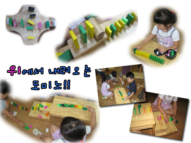 <도미노 쌓기> 놀이시간 도미노를 쌓는 유아들! 처음에는 긴 의자 위에 한 줄로 길게 쌓다가 점차 두줄, 세줄 이렇게 늘려가며 도미노를 쌓기 시작합니다. 도미노를 쌓던 중 의자 위에서 도미노 블록이 떨어져 아래에 있던 도미노가 쓰러지며 넘어가게 됩니다. 이를 재미있게 여기던 유아들은 위에서만 떨어지면 무조건 넘어질 것이라 생각했는데 그렇지 않는 경우도 있다는 것을 알게 되면서 <위에서 아래로 이어지는 도미노>를 쌓기 위해 연구를 시작합니다. 유아들은 다양한 방법을 시도하고 도미노의 위치와 거리를 맞추어가며 문제를 해결합니다. 문제를 해결한 뒤 잘 넘어가는 도미노를 보며 열광하던 유아들! 도미노를 쌓으며 새로운 것에 도전하고, 함께 의논하여 문제를 해결해 나가는 능력을 길러가길 바래봅니다.