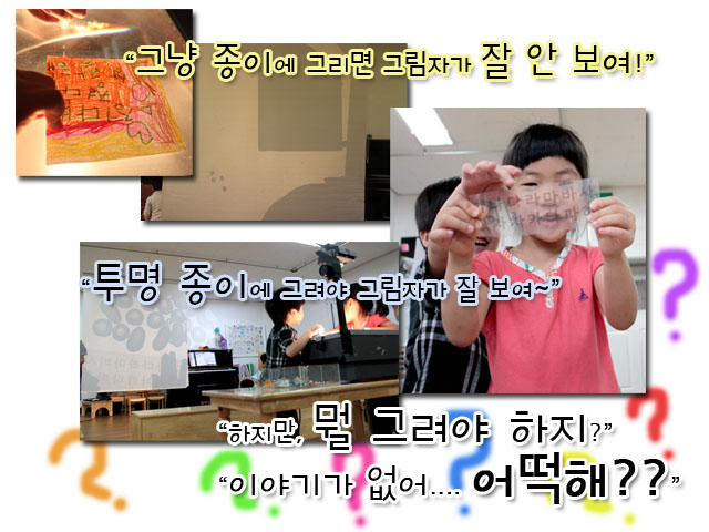 - 어린이들이 종이는 빛이 투과되지 않아 종이 위의 그림과 색깔들은 그림자로 나타나지 않는다는 것을 깨닫게 되었습니다. 하지만 곧 빛의 투과성에 대해서 알게 됩니다.