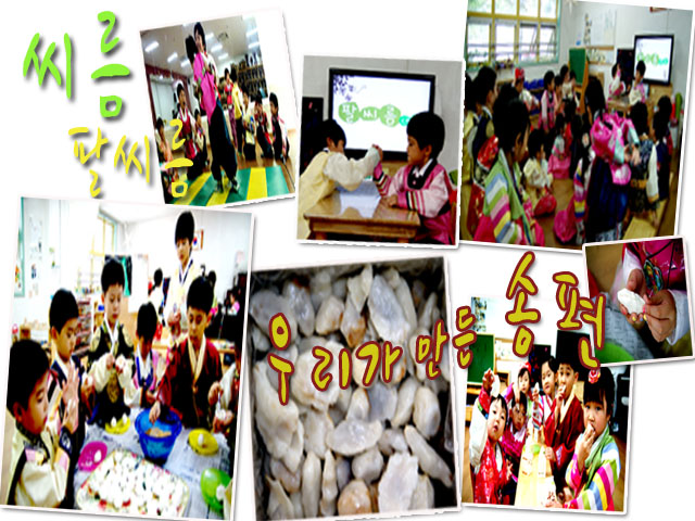 추석 때 많이 먹는 송편을 빚어요. 촉촉하지만 끈적이지 않는 반죽을 작은 컵 모양으로 만들고 깨가 들어간 달콤한 소를 한 숟가락 넣어요. 송편을 쪘더니 가루였던 소가 꿀처럼 변했어요. “우와. 맛있다. 우리가 만들어서 더 맛있다. 맞지~더 먹을래요~”