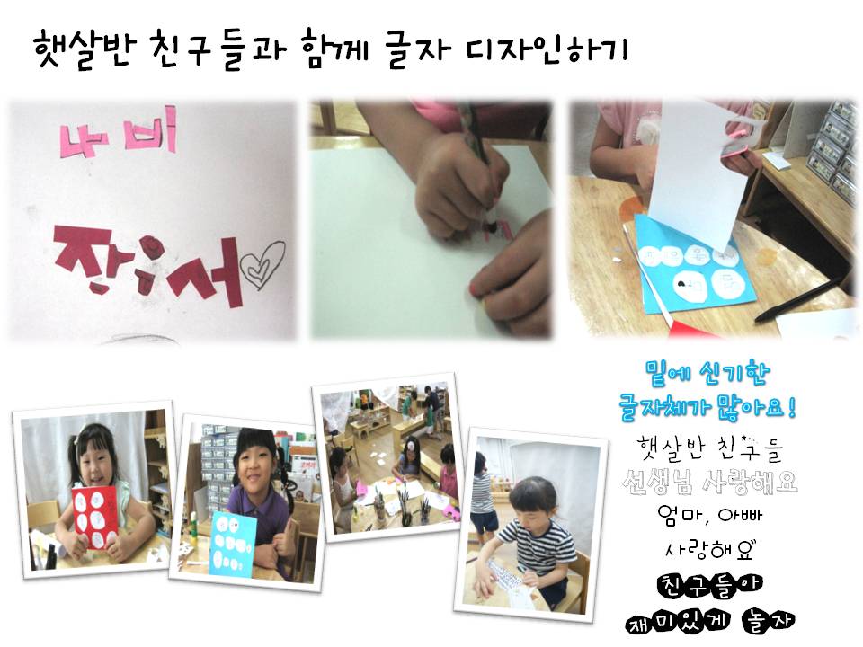 글꼴 디자인을 위해서는 먼저 다양한 글꼴을 컴퓨터로 접하고 그에 따른 느낌을 경험해봅니다. 친구들은 다양한 글꼴을 보며 자신만의 글꼴로 디자인하기 시작하였어요. 붓펜으로 글자를 날려 쓰기도 하고, 글자를 굵게 쓰기도 합니다. <◎>같은 글자에는 구멍을 뚫고 싶어서 반틈을 접고 자르면 구멍이 뚫으면 된다는 것을 알 수 있었으며 다양한 방법으로 글꼴을 만들었답니다. 글꼴 위에 알록달록한 색깔로 덧칠하기도 하고 무늬로 그리면서 디자인을 하였답니다. 햇살반 친구들이 각자 다른 생각과 느낌을 표현한 다양한 글자는 옆에 있어요. 앞으로 햇살반 친구들은 여러 가지 글자를 다양하게 디자인하는 방법을 함께 토의하면서 어떤 글꼴로 디자인을 하게 될지 기대해주세요