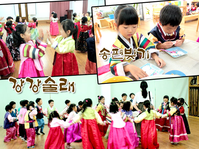 TV, 컴퓨터 등 혼자 하는 놀이에 익숙한 어린이들은 “전통의 날”을 통해서 그 옛날 우리 선조들이 그러했듯이, 친구들과 주고받으며 딱지를 치고 하늘반 친구들, 선생님과 함께 손잡고 강강술래를 하는 경험에서 공동체 의식과 더불어 사람과 사람의 어울림을 느꼈을 것이라 생각되어 집니다. 풍성하고 따뜻한 명절 추석. 온 가족이 모여 송편을 빚고 전통놀이를 하고 달을 보며 가족의 건강을 기원하면서 우리가 자랄 적 그랬던 것처럼 어린이들에게 우리나라 고유의 전통성과 역사성을 경험하게 해 주세요^^