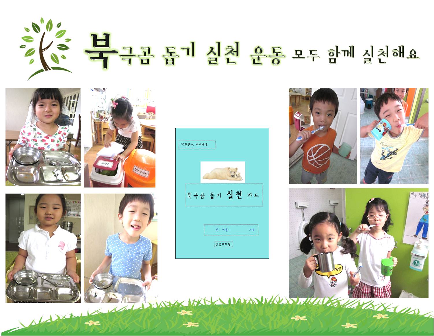 2개월간 북극곰을 돕기 위한 실천운동이 가정과 유치원에서 이루어졌습니다. 가정에서의 환경 보호 및 자원절약 운동은 잎새반 어린이들에게 환경보호에 대한 관심을 높였을 뿐만 아니라 교실에서의 북극곰 돕기 실천 항목인 <양치컵 사용하기, 잔반 남기지 않기, 분리수거 하기, 책과 내 물건 소중히 다루기, 테이프 낭비하지 않기 등>을 적극적으로 실천하는데도 긍정적인 영향을 주었답니다. 무엇보다도 잎새반 가족의 많은 관심과 적극적인 참여 덕분에 잎새반 친구들의 환경보호의식이 높아졌다는 것이 가장 의미가 있겠죠? 앞으로도 잎새반 친구들과 함께 환경 보호 운동에 적극적으로 동참하는 잎새반 가족의 모습을 기대해 보겠습니다.^^ 북극곰 돕기 실천 운동을 통해 적립된 에코 마일리지 점수가 의미있게 쓰여지게 될 <한림 녹색 장터>도 많이 기대해 주세요!^^