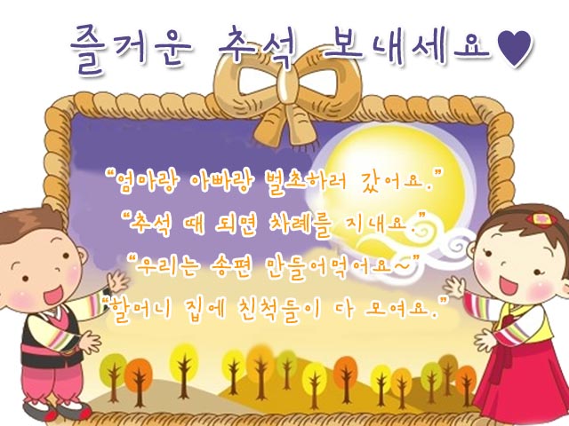 추석은 온 가족과 친척이 모여 가을의 풍요로움에 감사드리는 마음을 가지고, 여러 가지 음식을 나누어 먹는 날입니다.