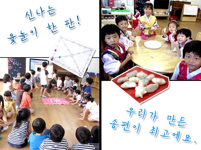 추석에 먹는 대표적인 음식인 송편을 만들어 보았습니다.멥쌀가루반죽을 떼어내 손으로 펴준 후, 깨와 설탕으로 만든 소를 넣어 빚어줍니다. 송편 모양은 조금 삐뚤삐뚤하지만, 고사리 같은 손으로 송편을 만드는 친구들의 모습만은 참 예뻐보였답니다.