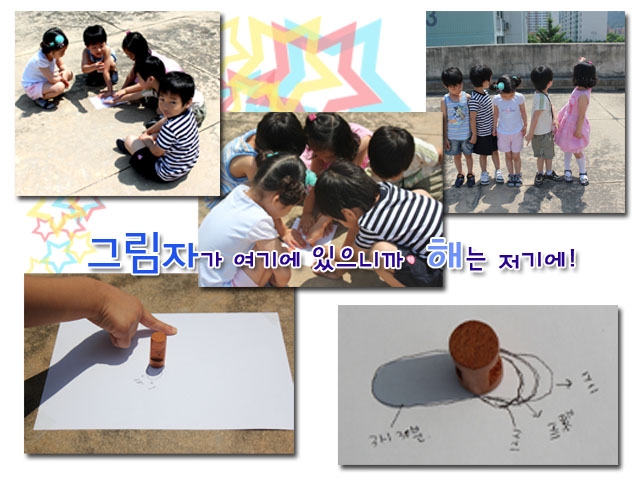 - 햇빛은 너무 눈부셔서 직접 눈으로 확인할 수는 없지만 해의 위치가 달라졌다는 것은 확신하는 어린이들! 해의 위치에 따라서 달라지는 그림자의 위치를 표상해보기로 합니다. 과연 어떤 표상이 나오게 될까요? 어린이들의 다양한 표상방법을 기대해봅니다.
