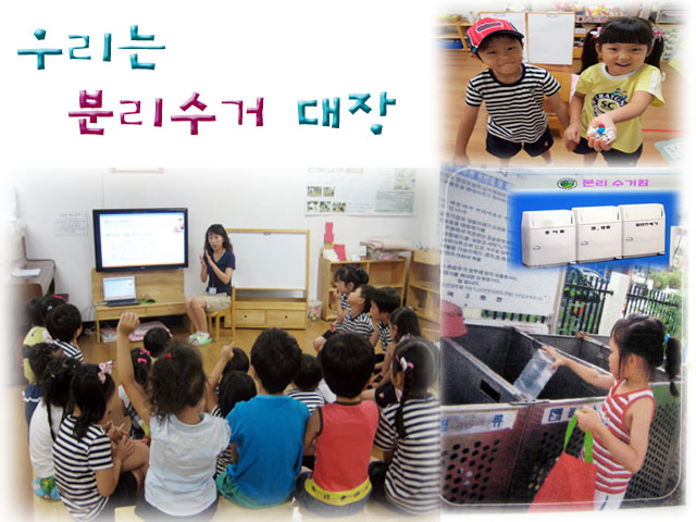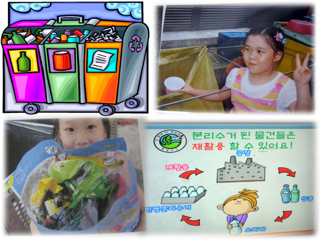 가정에서 잘 실천하고 있는 분리수거를 유치원에서도 실천하기로 하였답니다.
