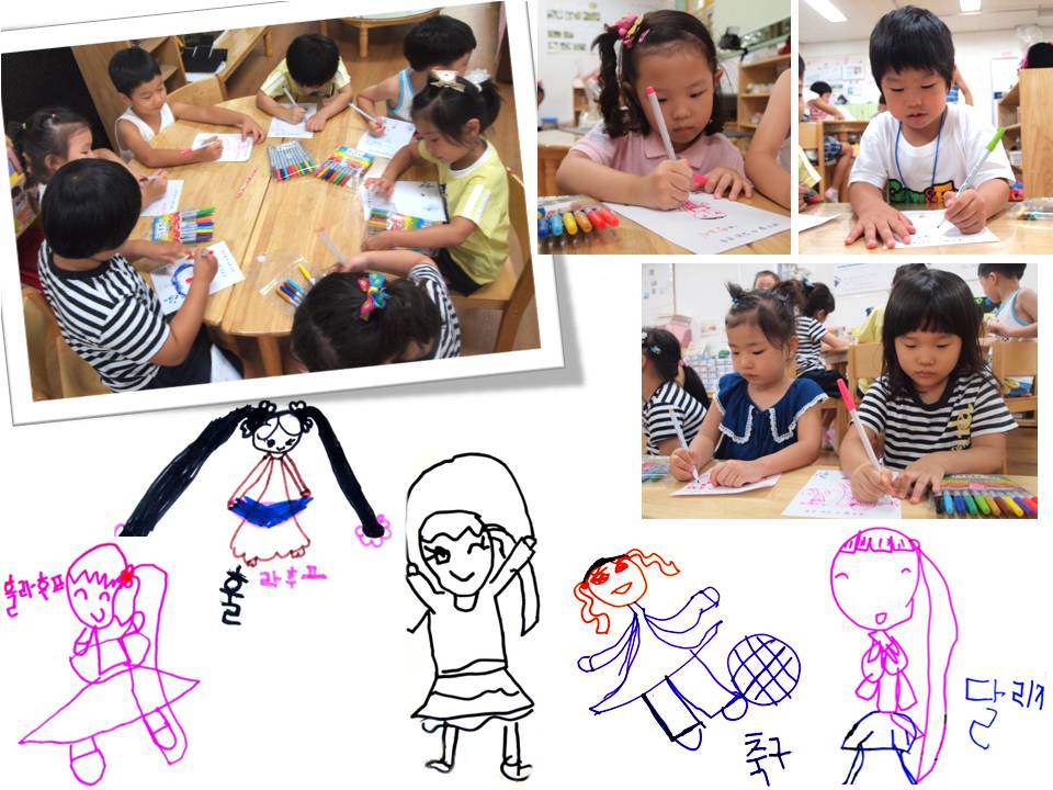 줄넘기, 체조, 달리기, 훌라후프, 축구, 농구, 피구, 배구, 자전거타기, 인라인 스케이트, 수영,… 등 우리가 할 수 있는 운동은 많이 있었습니다. 그 중 내가 가장 자신있는 운동을 그림으로 표현해 보았답니다.
