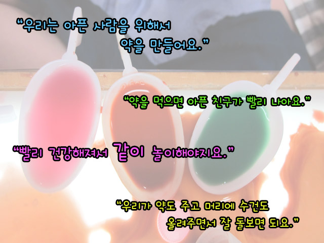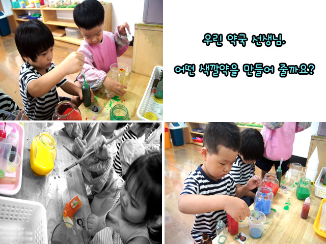 “이거는 파란색이랑 물이랑 섞으면 된데~” “그런데 빨강색 파랑색 노란색 초록색... 다 섞으면 검정색 된데.” “나 핑크색 약 만들고 싶은데” “그러면 빨강색이랑 하얀색 섞으면 된다.”
