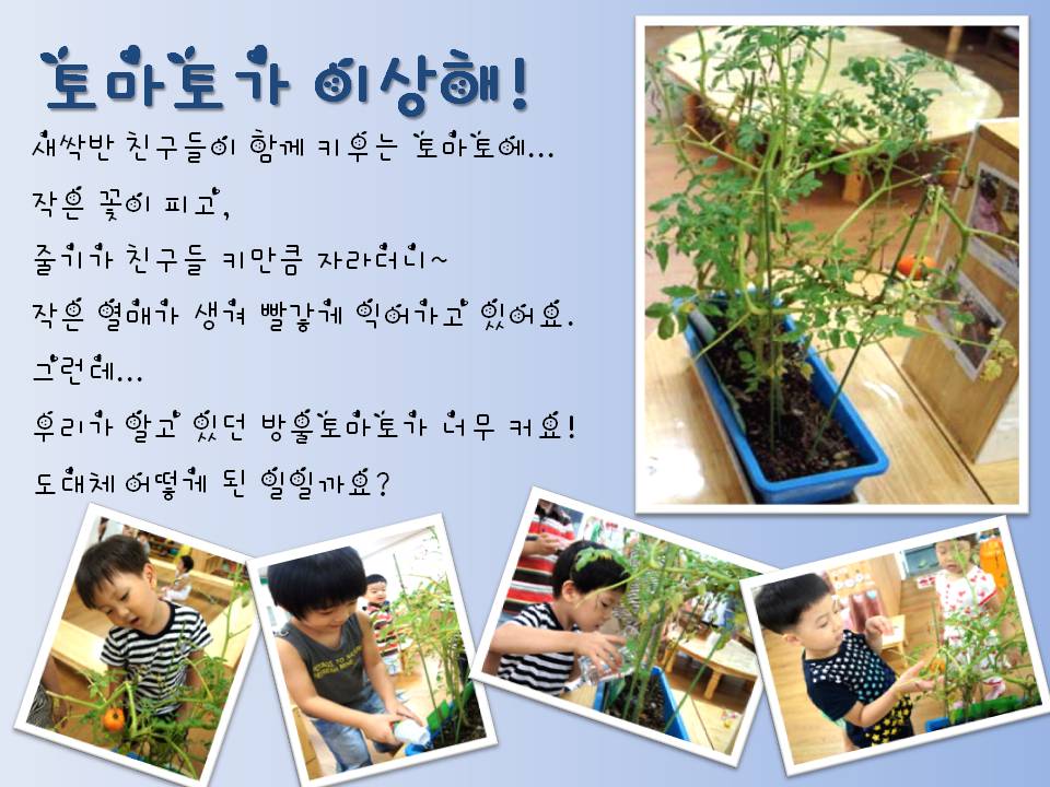 방학동안 보지 못했던 토마토를 보면서 이야기를 나눕니다. 그런데 토마토가 조금 이상해요. 새싹반 방울토마토에 도대체 무슨 일이 생긴 걸까요?