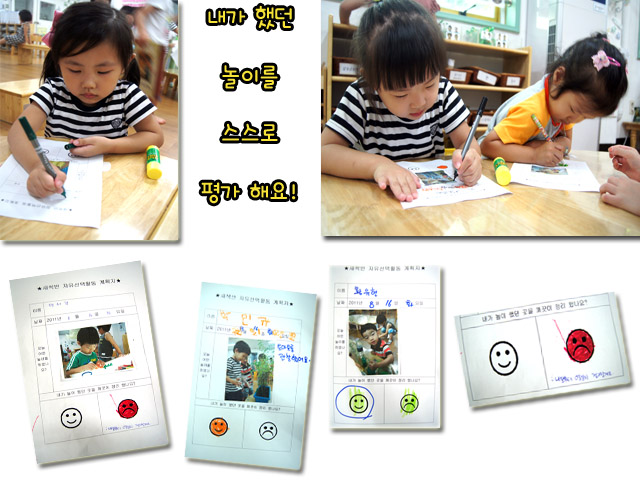 유아들은 자신이 했던 놀이를 되돌아보고, 놀이 후 정리에 대한 평가를 스스로 해 봅니다. 놀이 후 <평가지> 활동은 어린 유아들에게 자기반성적 사고를 가질 수 있도록 해 주며 자신의 행동에 대한 책임감을 기르는 기초가 될 거라 기대 해 봅니다.