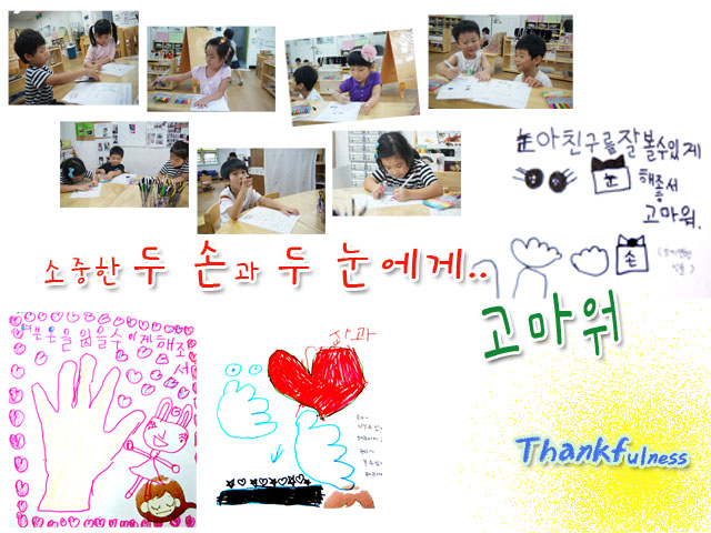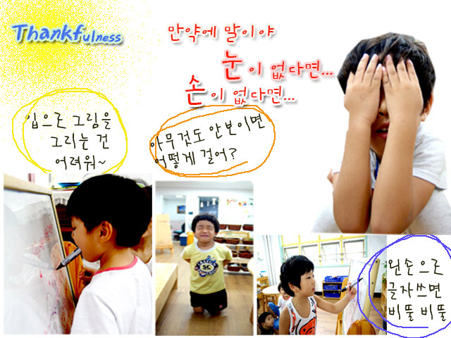 햇살반 친구들과 <감사>라는 말을 이야기를 나누어봄으로써 나에게 도움을 준 사람들에게 감사하는 마음을 가지며 감사하는 마음을 다양하게 표현하는 시간을 가져봅니다.#내게 만약 눈과 손이 없다면?