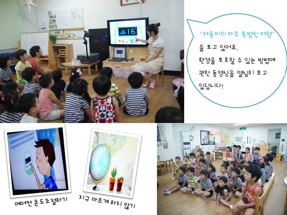 친구들이 실천하고 있는 환경약속을 좀 더 자세하고 재미있게 알아보기 위해서 동영상을 보았답니다. “제동이의 아주 특별한 여행”인데 학교에서 돌아오자마자 거실 조명부터 에어컨, TV까지 이것저것 다 켜놓았어요. 아픈 지구와 제동이를 연결시켜 제동이가 지구가 왜 아픈지 알게 되었어요. 햇살반 친구들은 지구를 아끼고 보살피면서 지구가 아프지 않도록 노력해요!