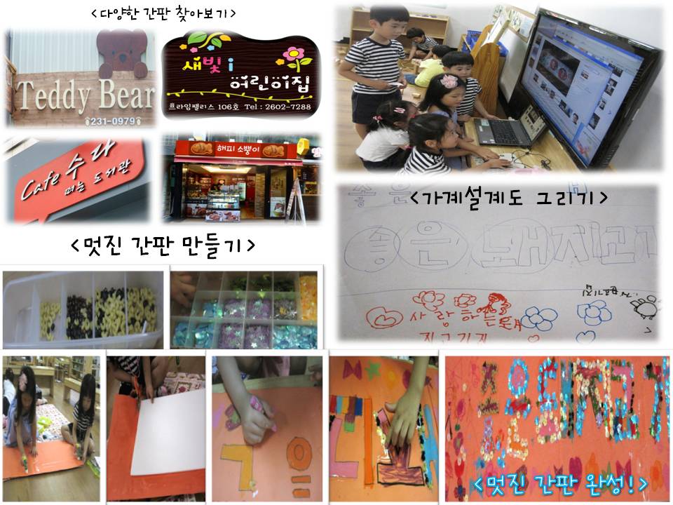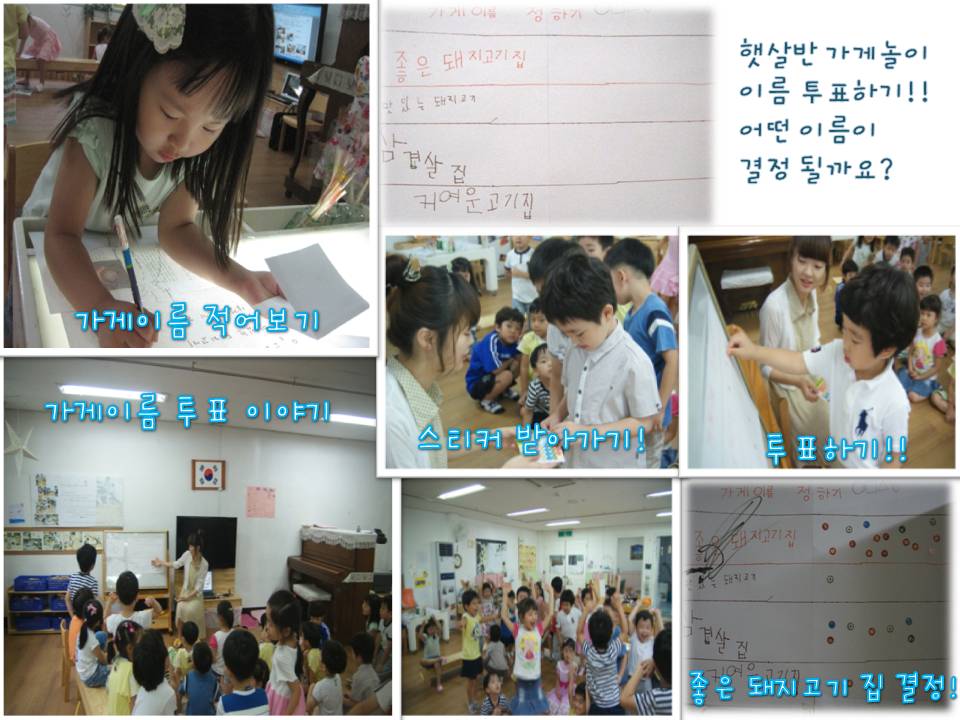 음식점 놀이를 하는 친구들이 햇살반 친구들을 초대하고 싶데요. 가장 먼저 해야 할 일에 대해 이야기를 나누어보았는데 가게간판을 새롭게 디자인하는 것이었어요. 친구들과 여러 가지 이름을 생각해보았는데 어떤 이름으로 해야 할지 고민이 되어서 햇살반 친구들과 함께 투표를 하기로 하였답니다. 가장 많은 표를 받은 이름으로 결정되는데 그 이름은 좋은 돼지고기 집이었어요. 결정된 <좋은 돼지고기 집>으로 친구들은 간판을 만들기 위해 많은 고민을 합니다. "인터넷으로 어떤 간판들이 있는지 한번 찾아보는 건 어때?"유아들은 인터넷으로 다양한 간판을 찾아봅니다. 다양한 간판을 본 뒤 더 멋진 새로운 간판을 만들기 위해 먼저 작은 종이에 간판 설계도를 그리기로 합니다.<좋은 돼지고기 집>라는 문구를 적으며 간판설계를 시작합니다. 유아2: 글자만 적으면 너무 허전해~ 그림도 함께 그리면 좋을 것 같아. 유아3: 맞아! 음식을 먹고 나가면서 간판 뒷쪽에는 <♥많이 오세요♥> 라고 적으면 어때? 유아4: 좋아! 글자는 색칠도 하고 매체로 꾸미기도 하면 더 잘 보일 거 같아.