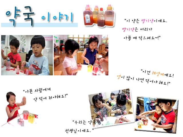 아이들은 스포이드를 사용하여 색깔 물을 섞고 약을 만들어냅니다. 자신이 먹었던 약의 이름, 색깔, 약의 효능을 등 그 경험을 떠올려 적용하고 놀이를 확장시켜 나갑니다.
