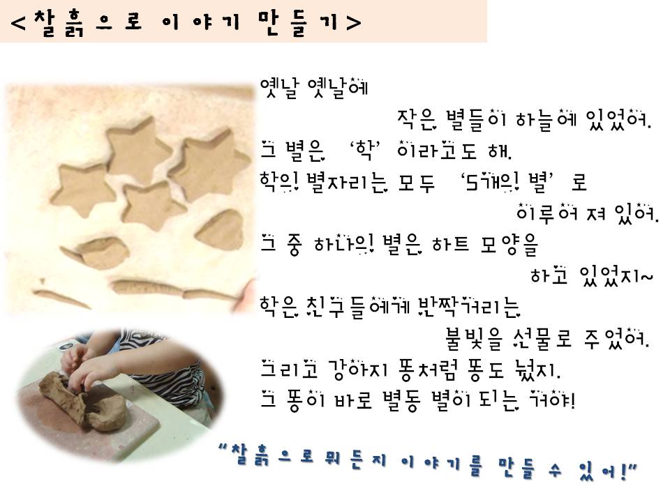 T: 지금 뭐 만들고 있는 중이예요? C: 난 오늘 화채 만들어서 찰흙으로 화채를 만드는 거야. 맛있게 만들어서 나눠 먹자~ C: 나도 케이크 만드는데... 케이크 만들어서 생일축하~합니다~ 해야지. C: 이건별인데 별이 이어져서 학이 되는 거야. 책에서 본 하늘의 별자리처럼... C: 이것봐~찰흙을 길게 늘여 뜨리니까 학이 똥 누는것 같아. 강아지 똥에서처럼 말이야!