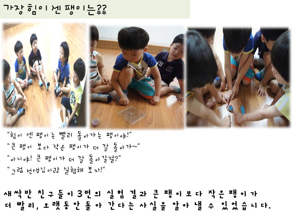 새싹반 아이들이 말하는 힘이 센 팽이는 작은 팽이, 잘 돌아가는 팽이를 말하는 것이였습니다. 세다는 정의와는 다르지만 새싹반 친구들 나름의 정의로 팽이 시합을 하고 있답니다.