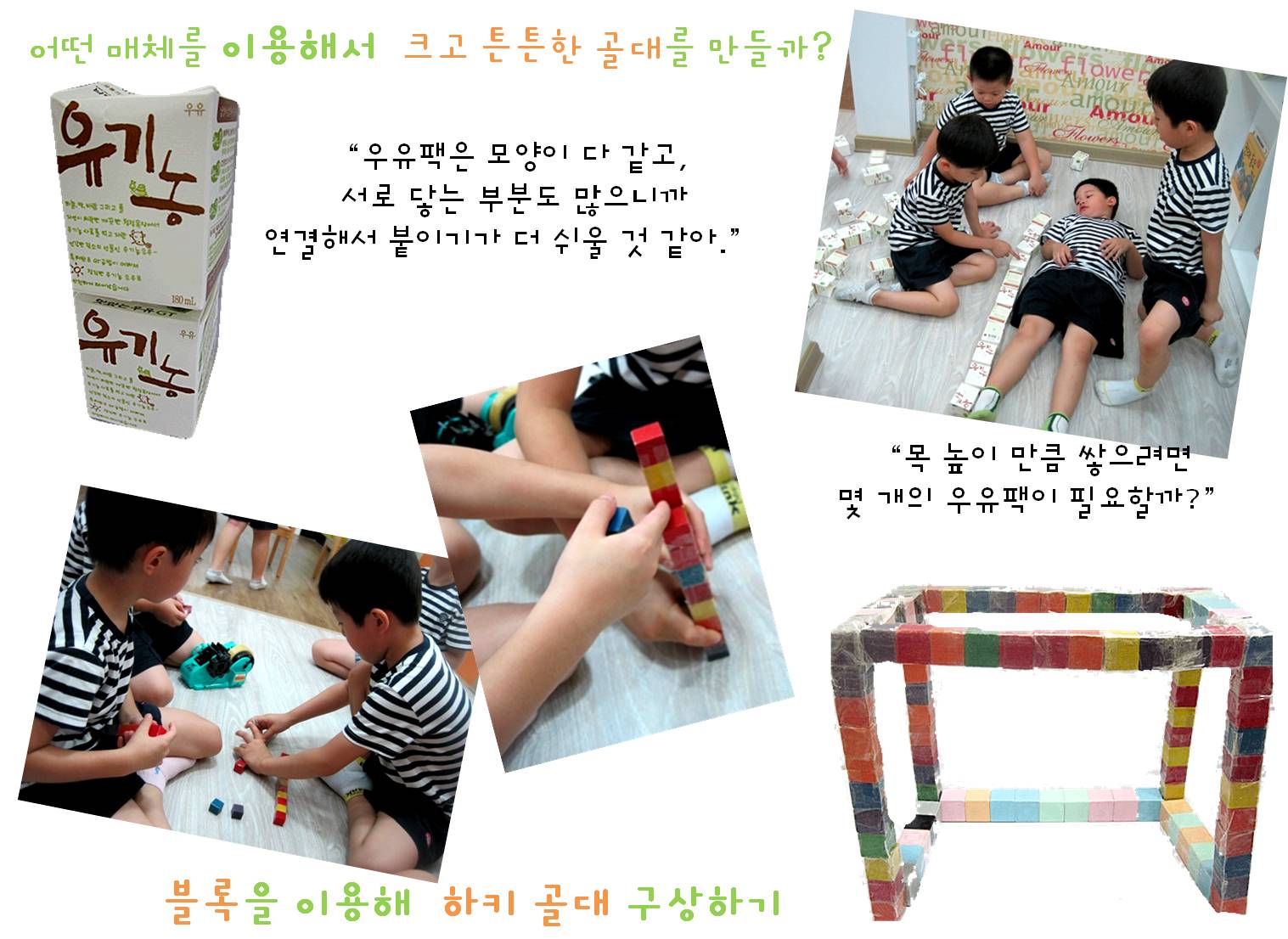 “하나, 둘, 셋, 넷..... 열 하나! 열 한 개의 우유팩이 필요해요!”, “기둥이 양 옆에 2개만 있으니까 골대가 자꾸 기울어져요!”,“기둥이 4개 있으면 앞에 있는 기둥을 잘 받쳐줄 것 같아요.”“지난번에 우리가 봤었던 골대도 기둥이 4개 였어요.”, “기둥을 연결하는 받침대도 있어야 해요!”