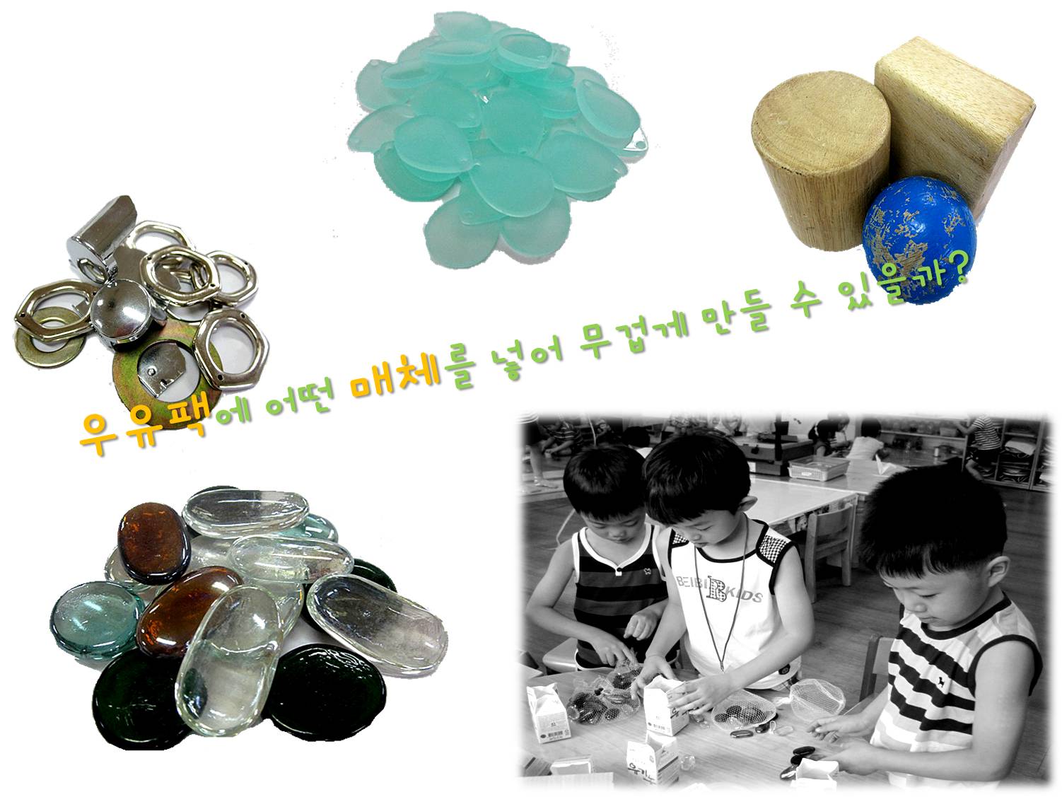 “우유팩은 가볍기 때문에 큰 골대를 만들었을 때 쓰러질 수 있어요.”, “우유팩 안을 무겁게 채워야 겠어요!”, "밑에는 무겁고 위에는 가벼워야 하니까 기둥 반틈 만큼만 무겁게 채워야 할 것 같아요!" 어린이들은 블록, 구슬, 나사 등 다양한 매체를 탐색하며 적절한 무게를 지닌 매체를 찾아 봅니다. "이 투명한 돌은 어때요? 우유팩에 넣어보니 무거워요!", "투명한 돌은 유치원에도 많으니까 우유팩에 넣어도 좋을 것 같아요!"